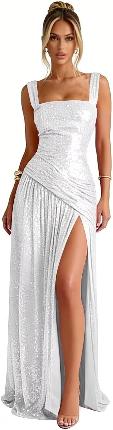 | Embellishment Feature | corset back ruched pleated, high slit with slit side split, sexy mermaid tight Bodycon, spaghetti strap square neck, sparkly sequin glitter |